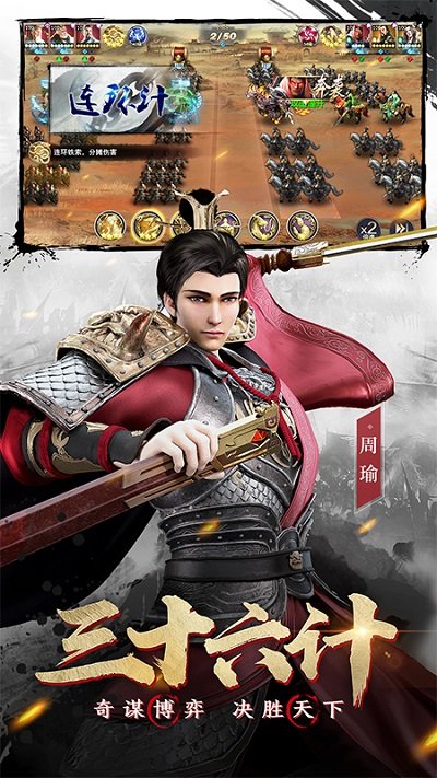 《三十六计》诚邀主公于乱世中运筹帷幄,并通过前中后三军的排兵布阵与对手在微观对局中一较高下;体验宏观战斗指点江山的大策略!于沙场中披荆斩棘,创造属于你的三国!在游戏中你可以利用计策系统,也可以在世界大地图上调兵遣将,以天下165座城池为棋盘,博弈三国,一步千算,这一次你决定历史!