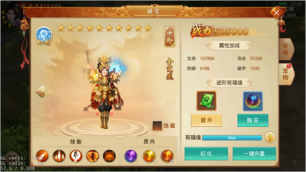 3 坐骑和宠物进阶上限为10阶,每升一阶所需要的祝福值越多,除了进阶丹外,还可以使用祝福卡提升祝福值(一张祝福卡增加150祝福值)