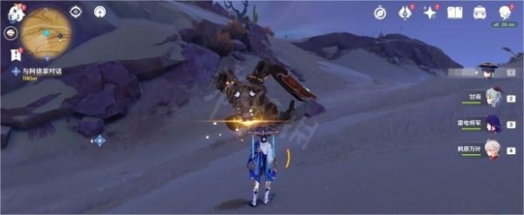 第二只仙灵的位置在秘境另一侧的高台上(高台边缘有个四叶印帮助移动),参考下图中的小地图位置,到达该位置附近可以看到一只遗迹龙兽空巡,仙灵就在它旁边。