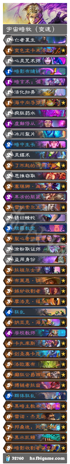 宇宙暗牧的强势相信大家都能体会,这里不多阐述,主要介绍一下新的这套变速构筑:携带大量一费随从,配合邦桑迪可以检索过牌,比较常见的用法就是后期摸到邦桑迪可以打出去然后芬利洗一波,瞬间资源拉满。变速宇宙暗牧在对阵开门法等OTK卡组时更为优势,但解牌携带的较少,对战快攻会略显吃力。