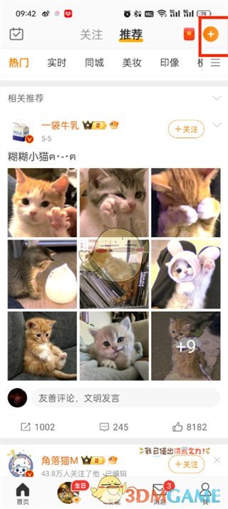 1、首先打开微博软件中,进入到首页中后可以看到推荐的微博,我们在这里点击右上角的【加号图标】;