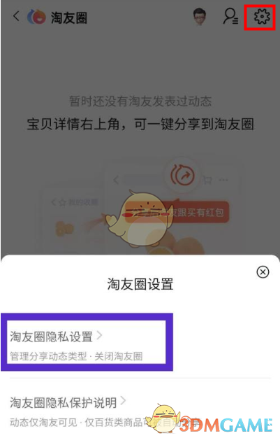 2、进入淘友圈后,点击右上角“设置”,然后点击“淘友圈隐私设置”
